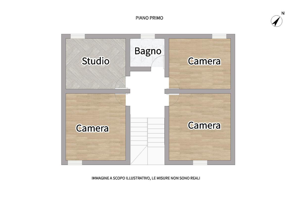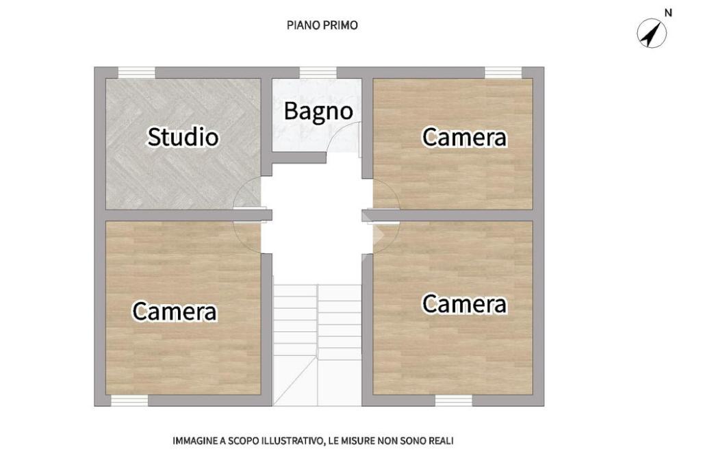 Salendo al primo piano si sviluppa la zona notte, composta da due camere matrimoniali, una cameretta, un comodo studio e un bagno finestrato con box doccia.
